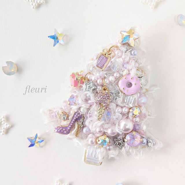 沢山の可愛いオーナメントを詰め込みました。 ピンクとパープルを基調としています。 ブローチになっています。 スワロフスキーのストーンやパールを沢山使っています。 ※水濡れにご注意ください。 ツリー大きさ たて約8.5センチ 横約7センチ ブローチ金具2つ 使用材料 miyukiビーズ tohoビーズ シルキーパール スワロフスキーストーン スワロフスキーパール デリカビーズ 日本製ブローチ ガラスビーズ 金具はメッキです。 ※裏側写真参照 こちらはフェイクレザーのまわりを縫い付けております。 ★ブローチは回転式の日本製 裏側のフェイクレザーのお色はお任せください ビジューの爪にお洋服が引っ掛からないようにご注意下さい。 金具やビーズは時間の経過とともに酸化して色褪せが生じる場合がありますので、ご了承下さい。 お使いになられた後、柔らかい布で優しく拭き、空気に触れないように収納して頂けると長持ちします。 ビーズ刺繍は大変難しく歪みなどがございますので、ご了承ください。 ビーズは一粒一粒手作業で縫いつけています。 ハンドメイド作品ですので、ひとつひとつ個体差が出てきてしまいます。 それも、ハンドメイド作品、世界でひとつのアクセサリーと思って頂ければと思います。 とても繊細なアクセサリーです。大切にお使いになっていただけると嬉しいです。 何か、ご質問があればお気軽にメッセージください。