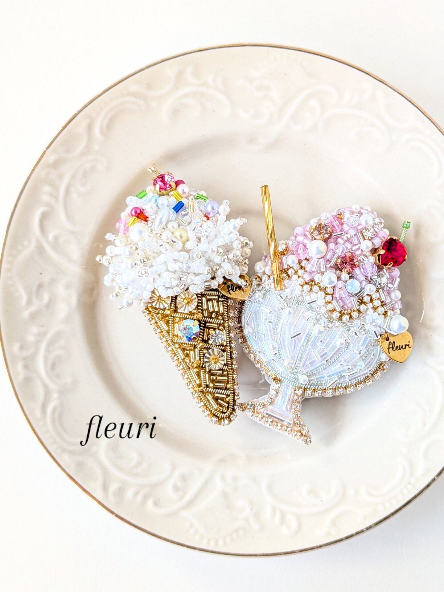 ハートのさくらんぼがついた淡いピンク色のかき氷のブローチです。スワロフスキーを沢山散りばめたのでキラキラで可愛いです!