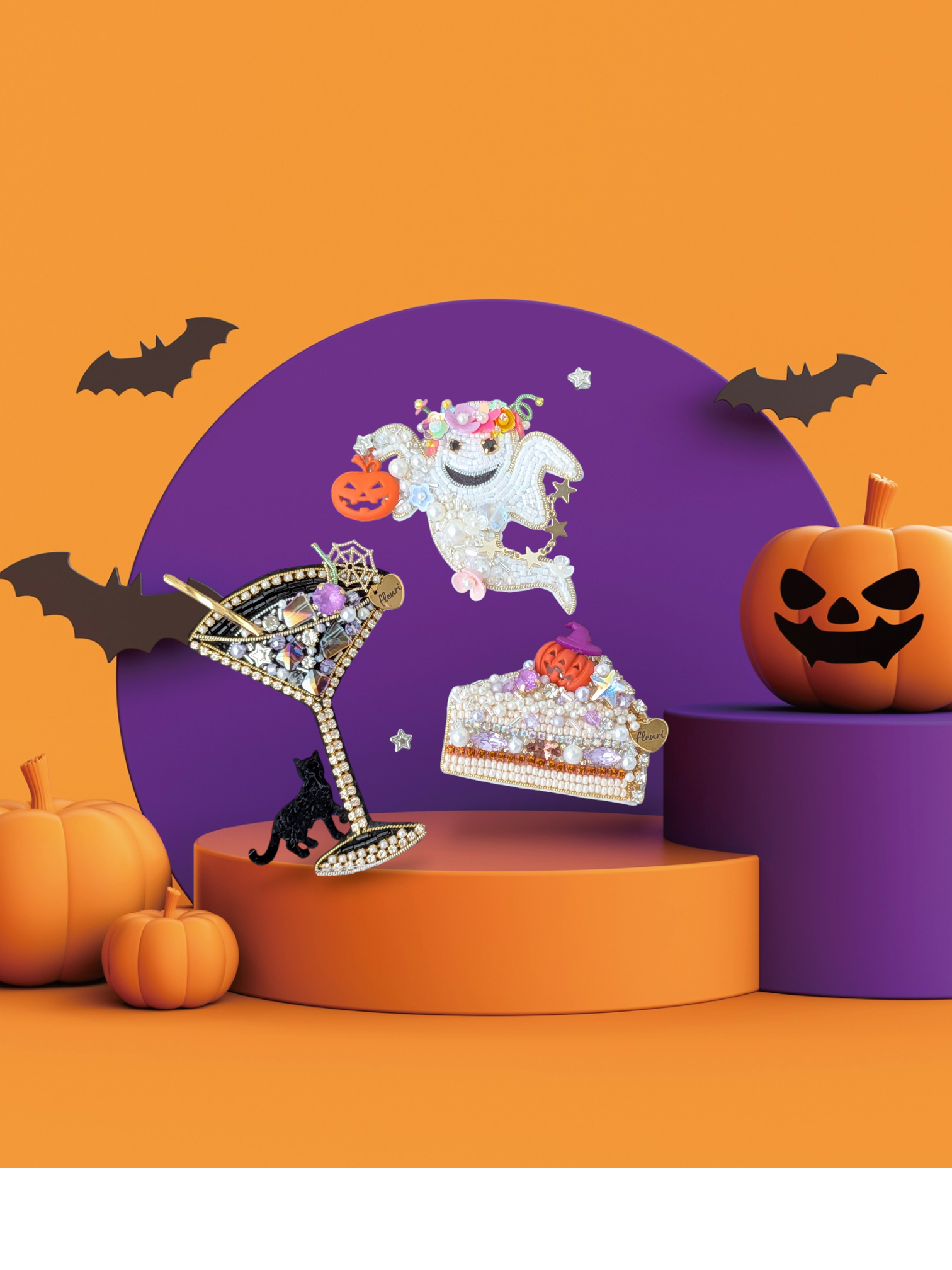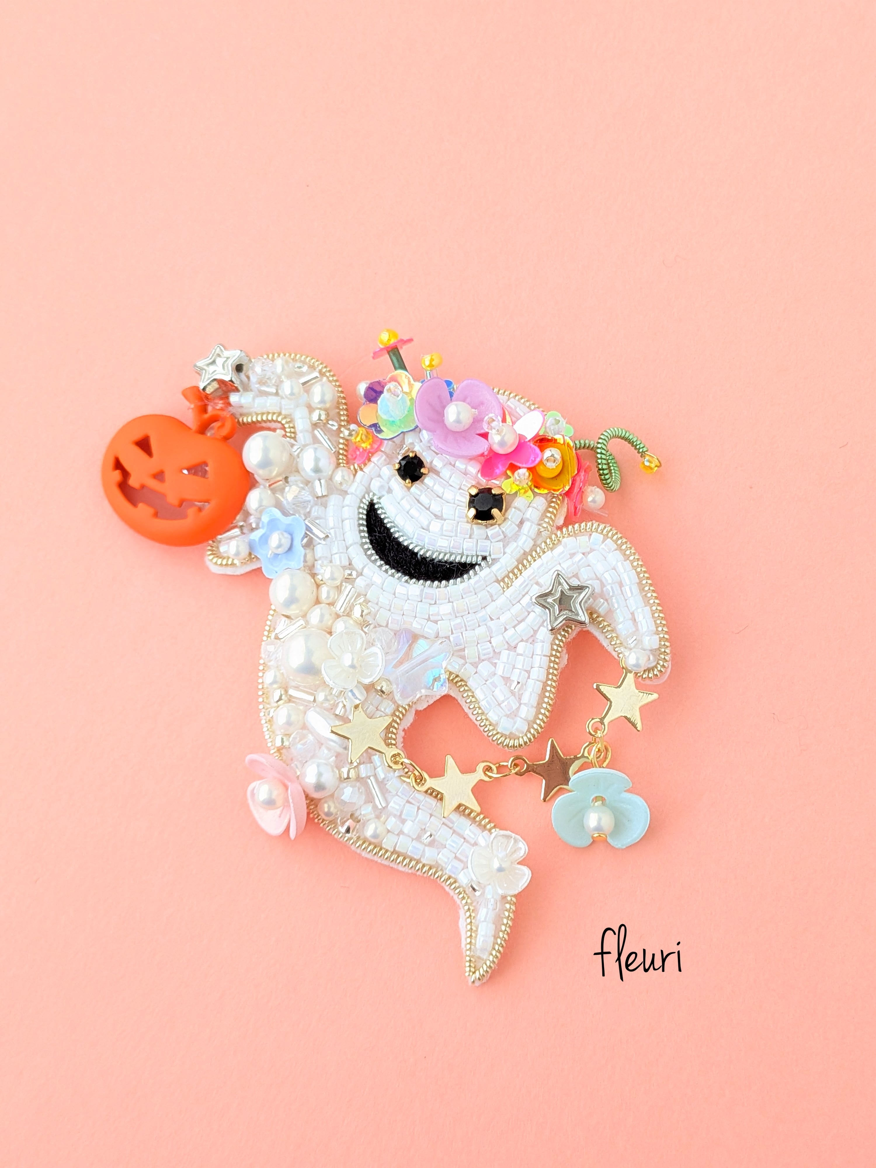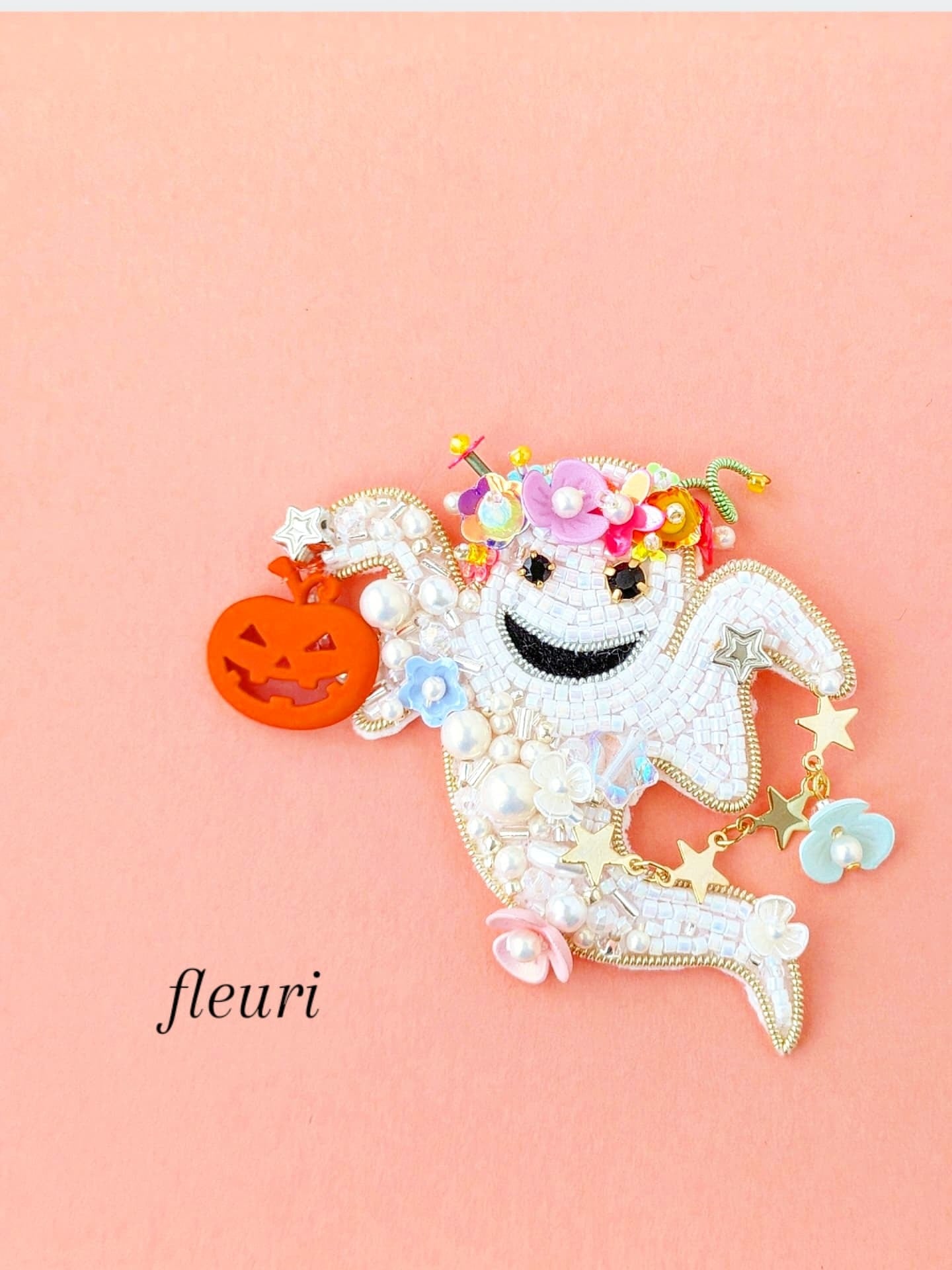 手にはジャックオーランタンと、花のガーランドを持っています。花冠をかぶった姿もかわいいです。