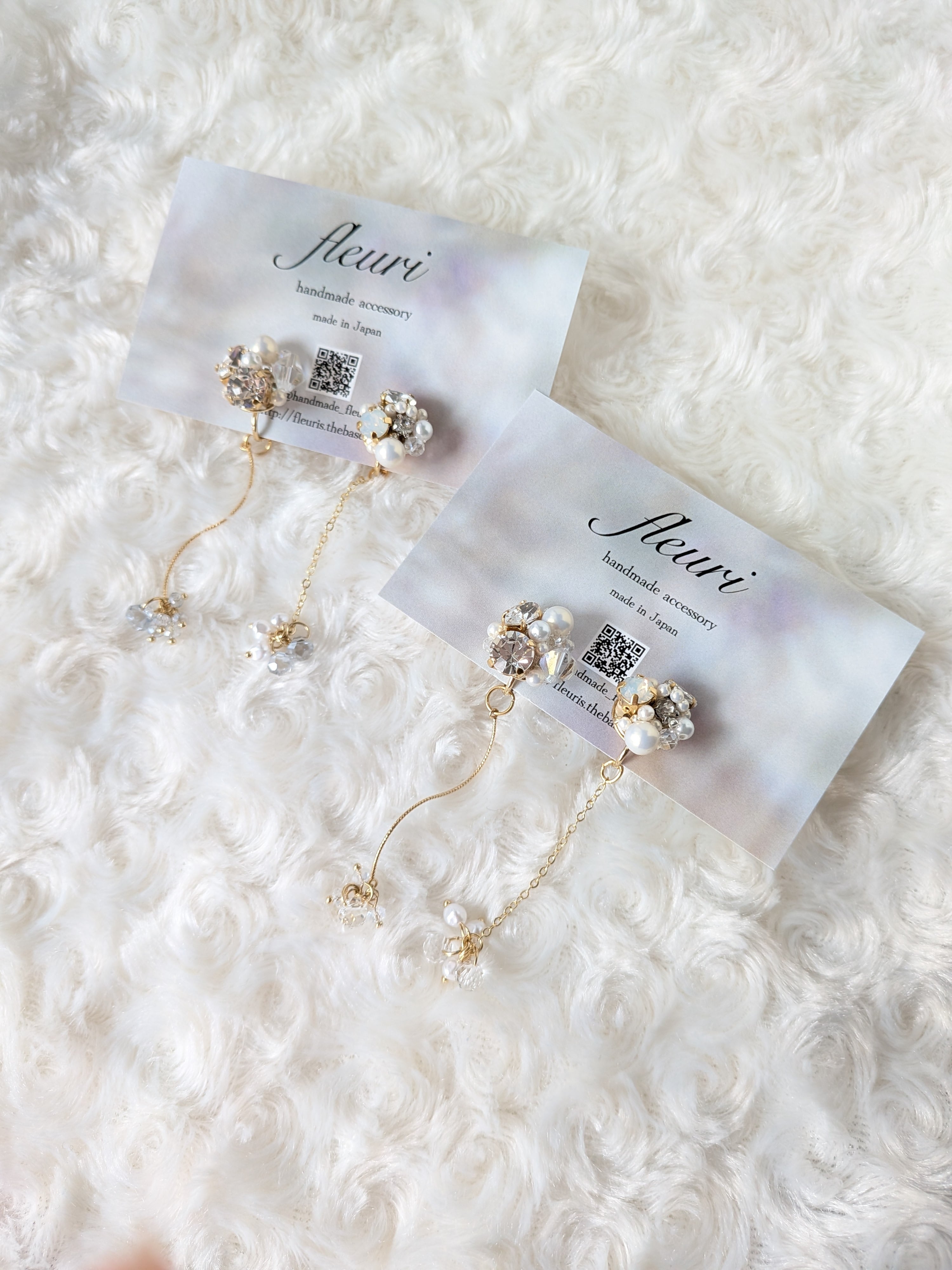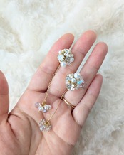 シャワー台にテグスで編み込んだビジューのイヤリングです。