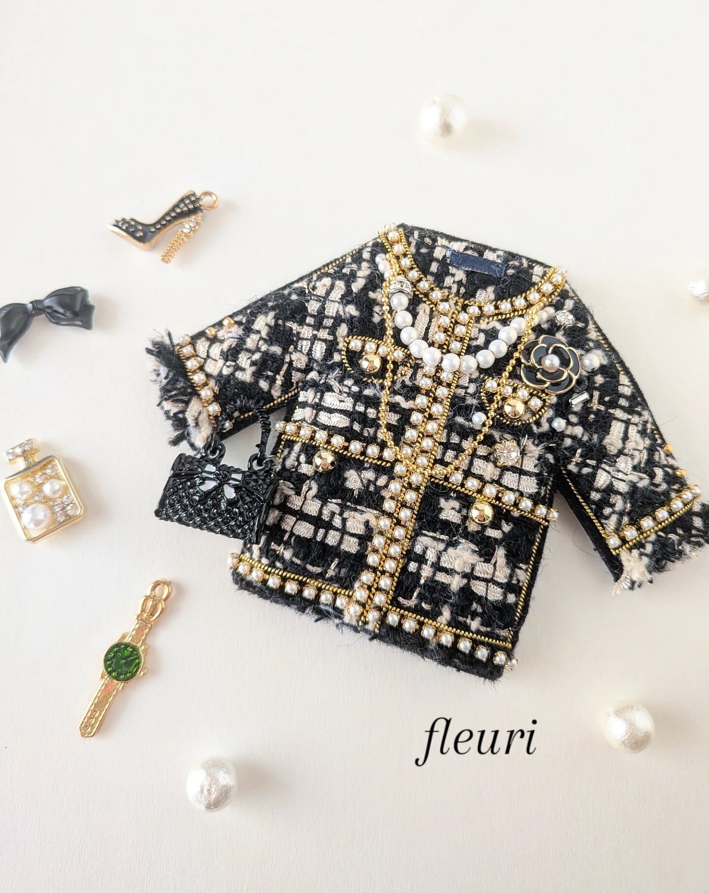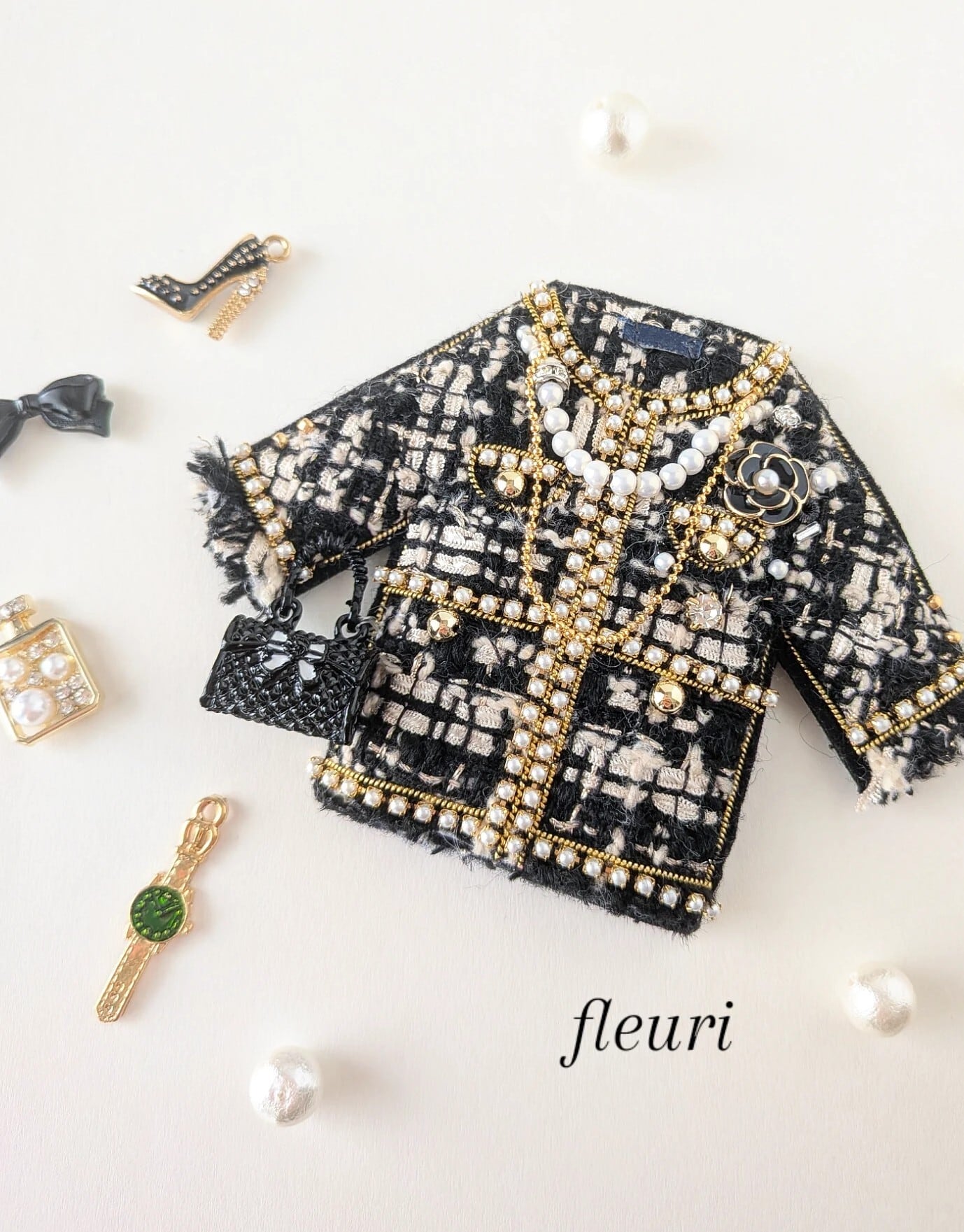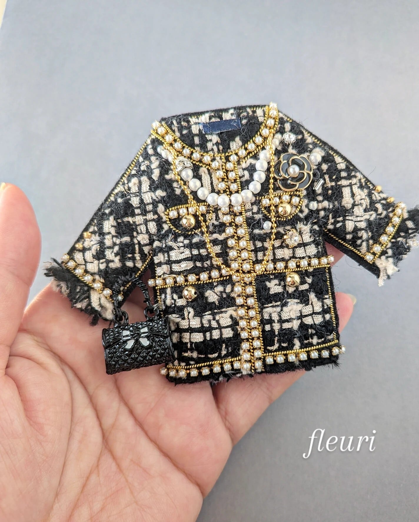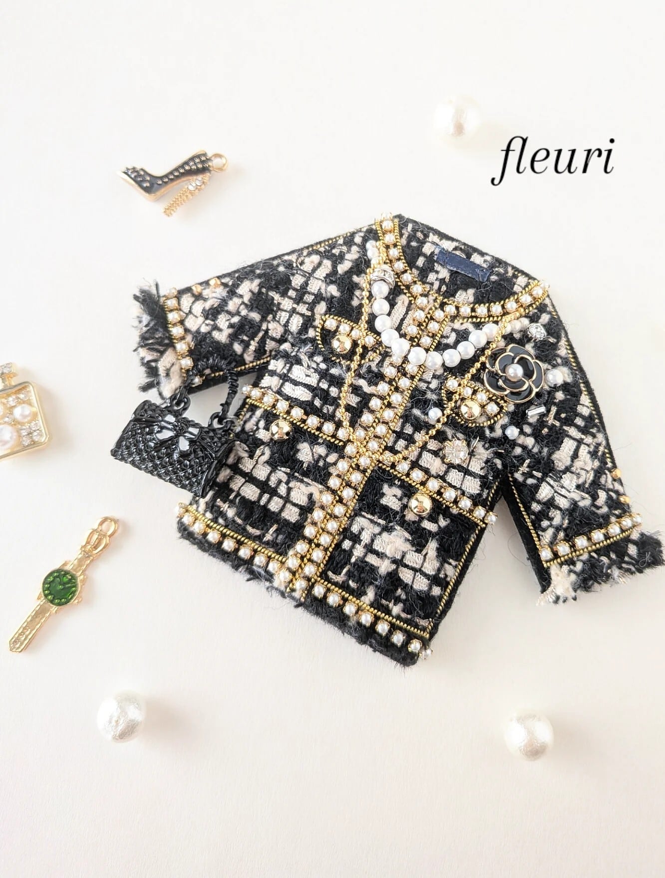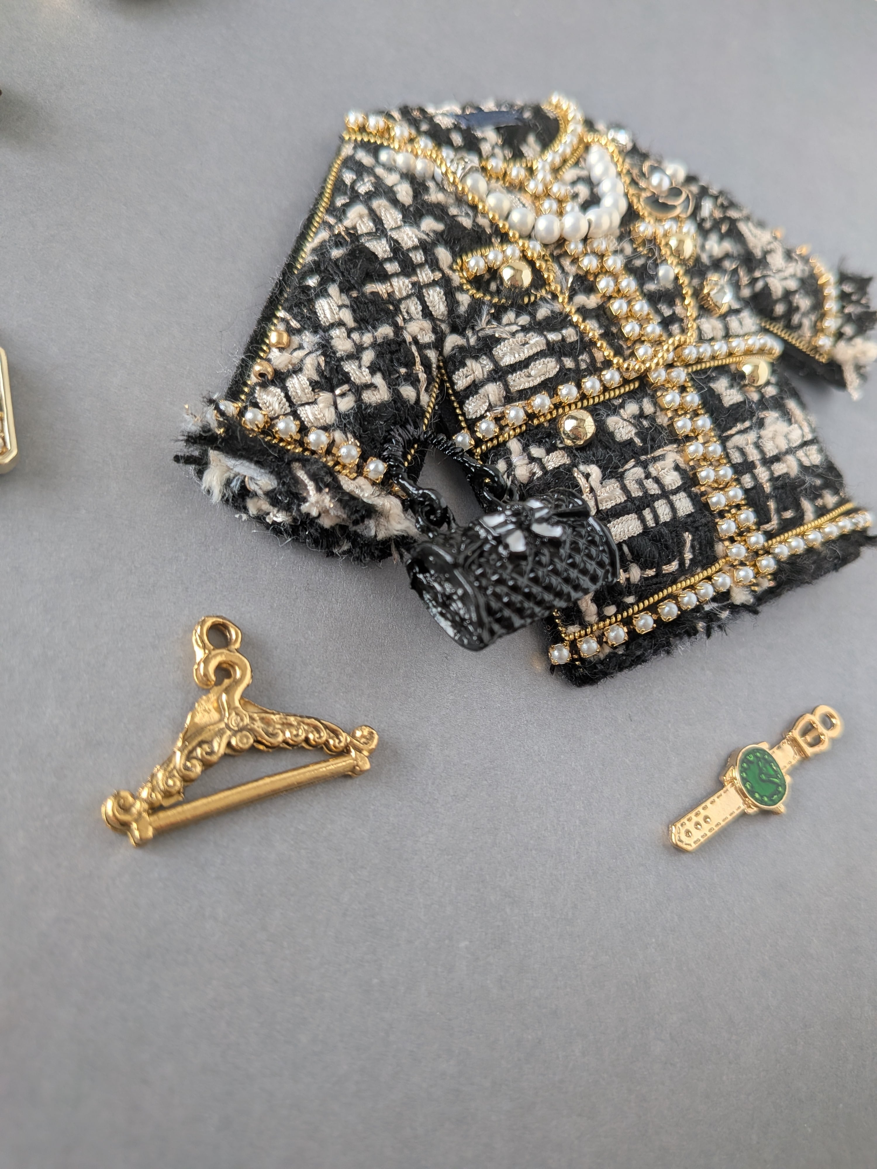 ブラックツイードジャケット ブローチ兼バッグチャーム