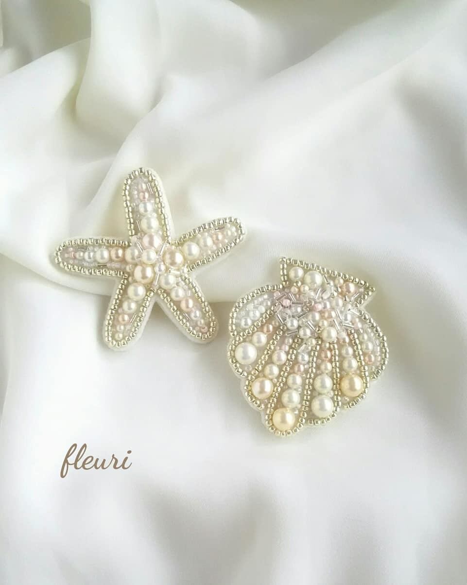 シェルとヒトデのビーズ刺繍のハンドメイドピアスとイヤリングです。