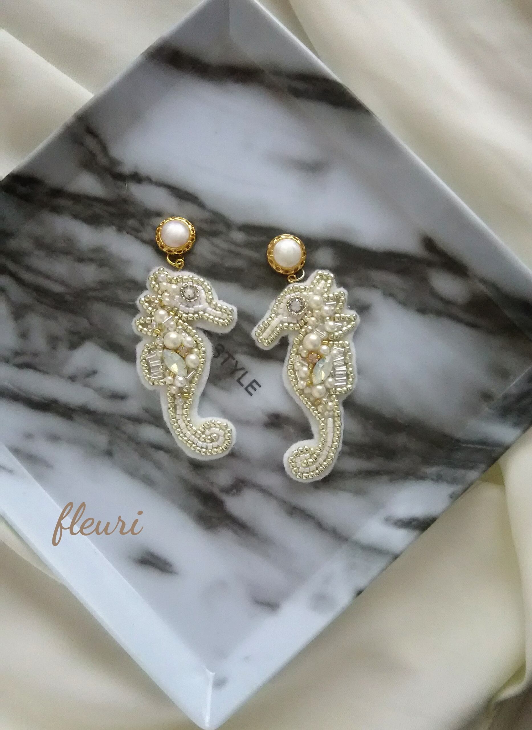 タツノオトシゴのビーズ刺繍のハンドメイドピアスとイヤリングです。