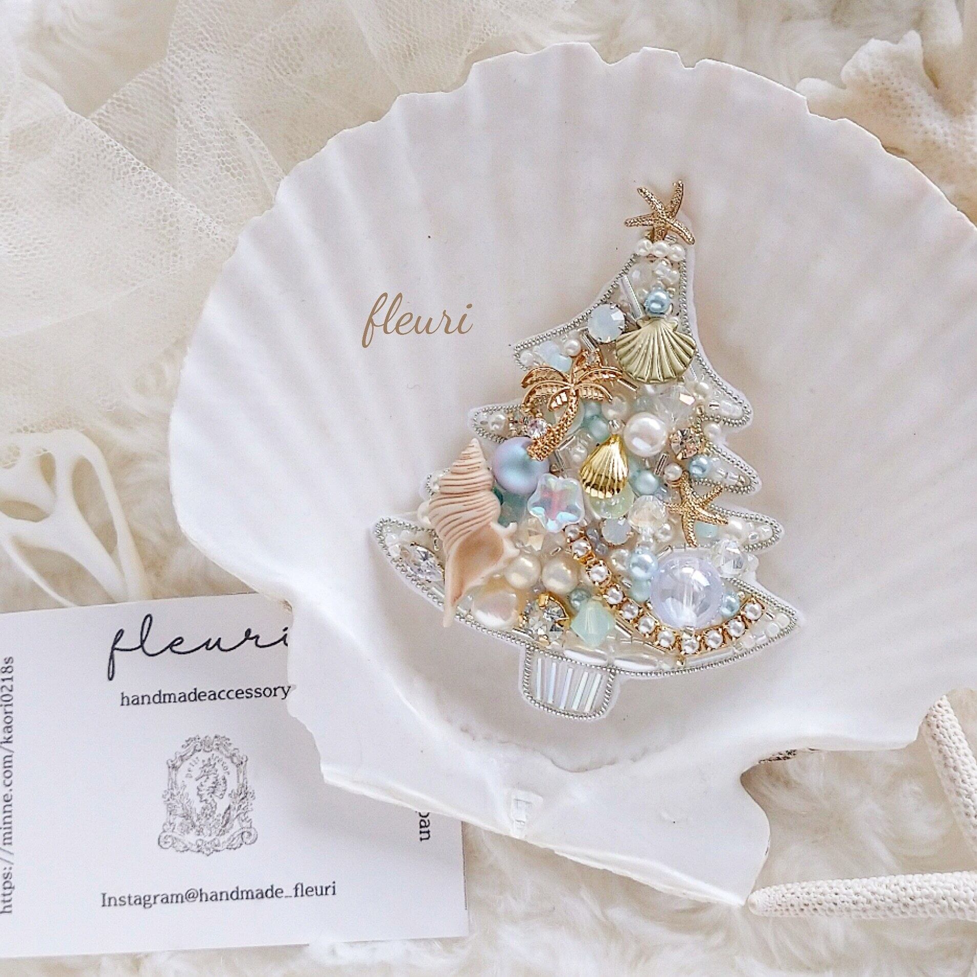ツリーには貝殻やヒトデ、ヤシの木がついていて、白とブルーのお色味のパールやビーズを沢山詰め込みました。