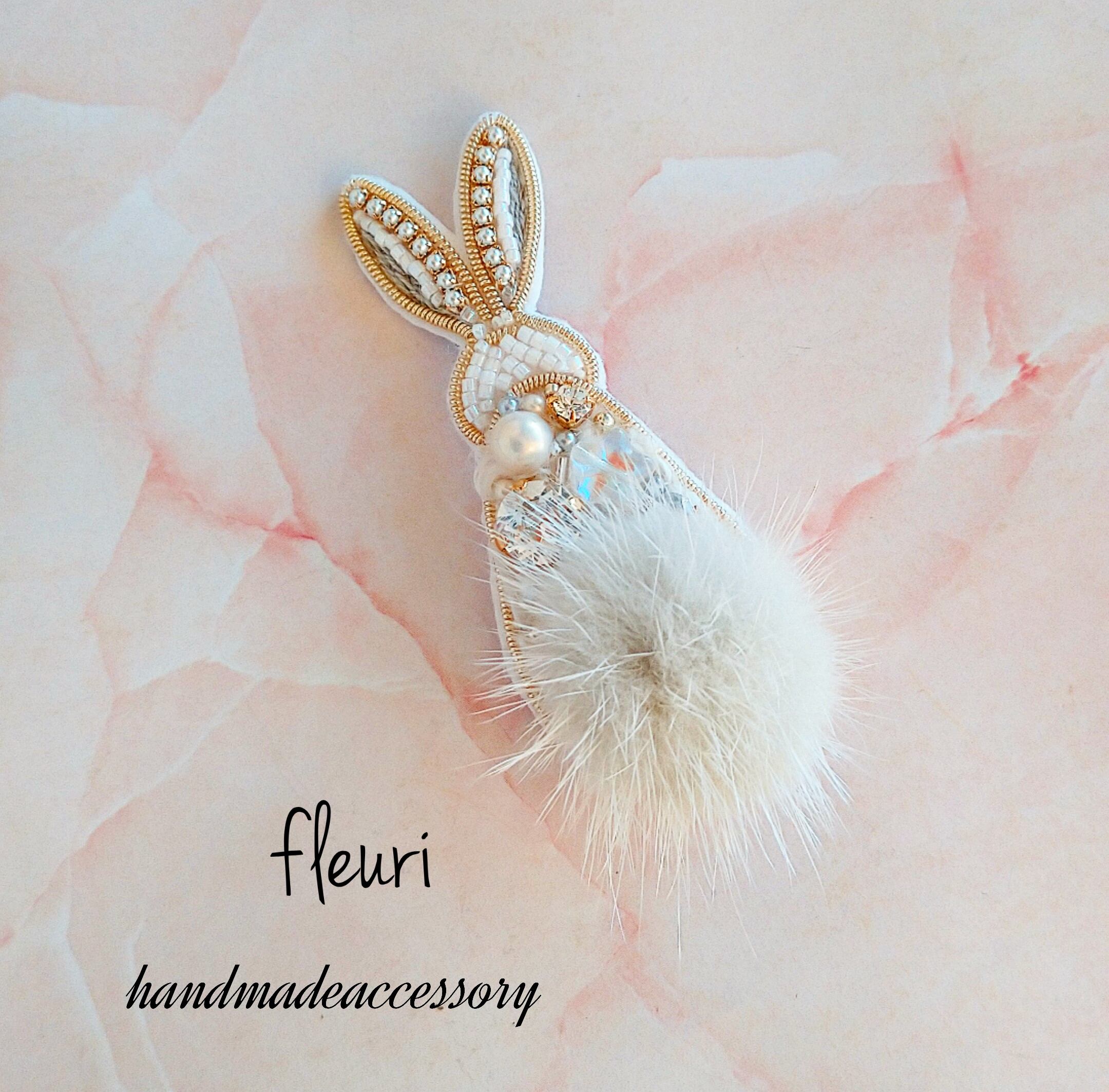 こちらはしっぽにアイスグレー色のミンクファーを使ったうさぎの後ろ姿ブローチです。