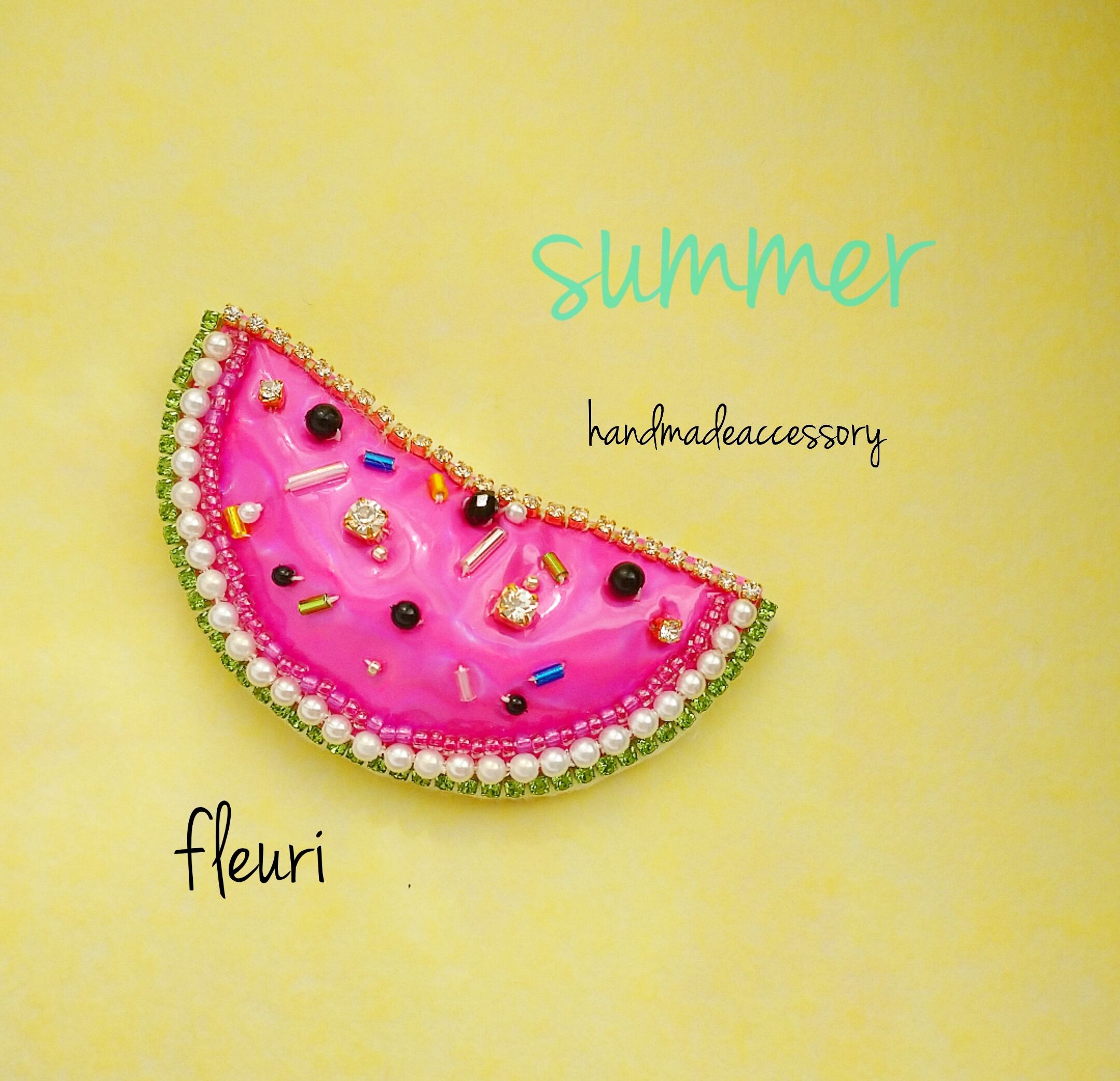 スイカ生地はフェイクレザーで種はパールやビーズで作りました。