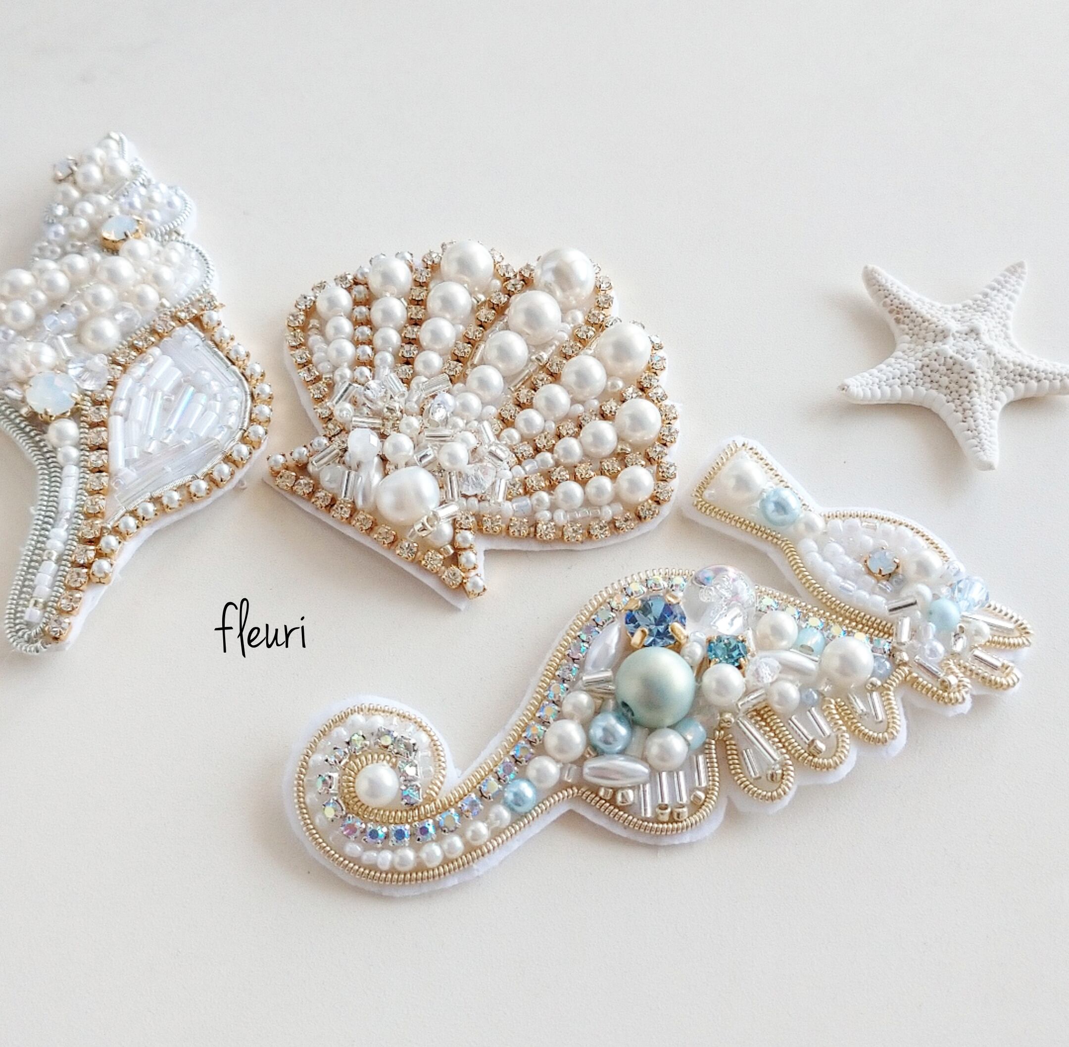 キラキラ輝いた二枚貝のビーズ刺繍のハンドメイドのブローチです。写真一枚目の商品です。