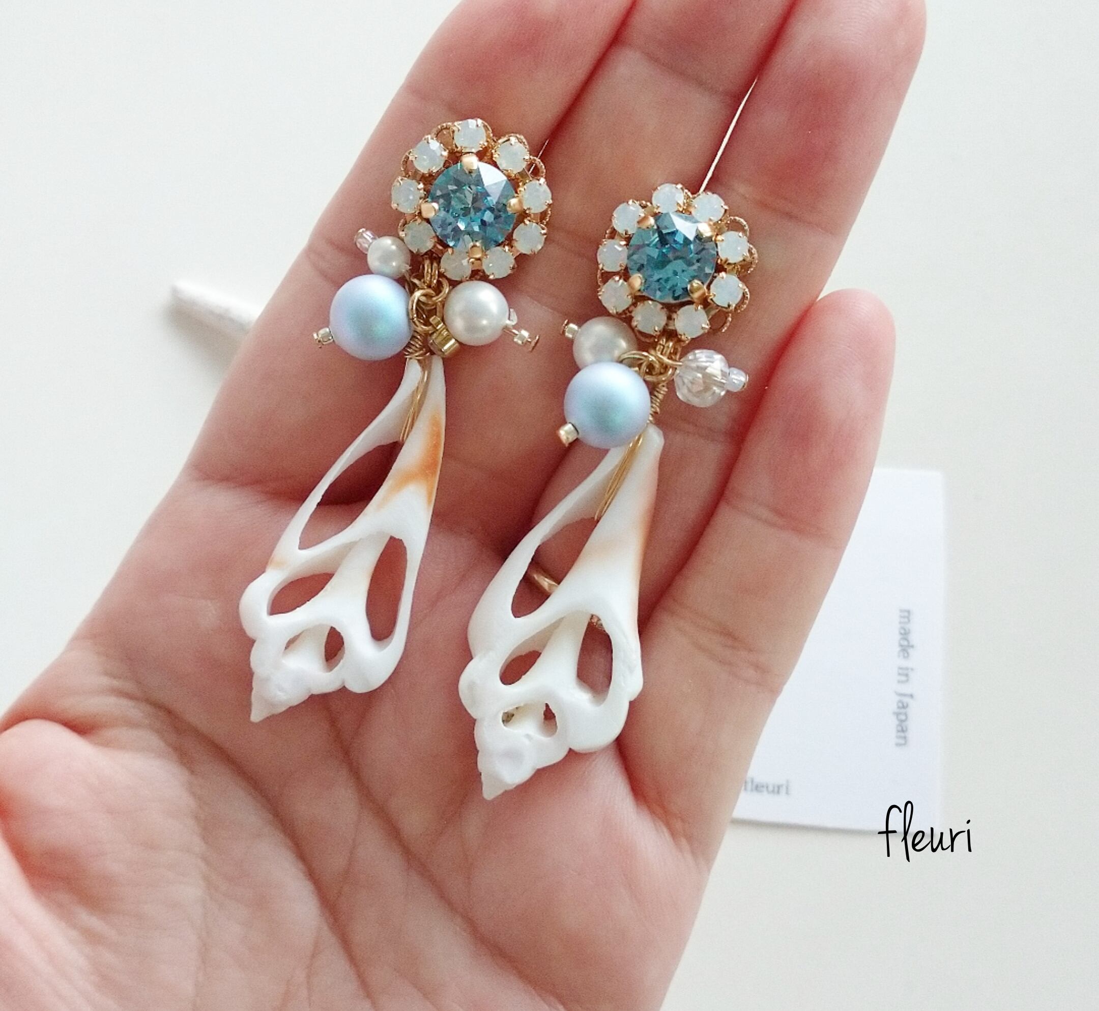耳元にはブルーのスワロフスキー、ゆらゆら垂れ下がる貝殻はホワイトデュウです。