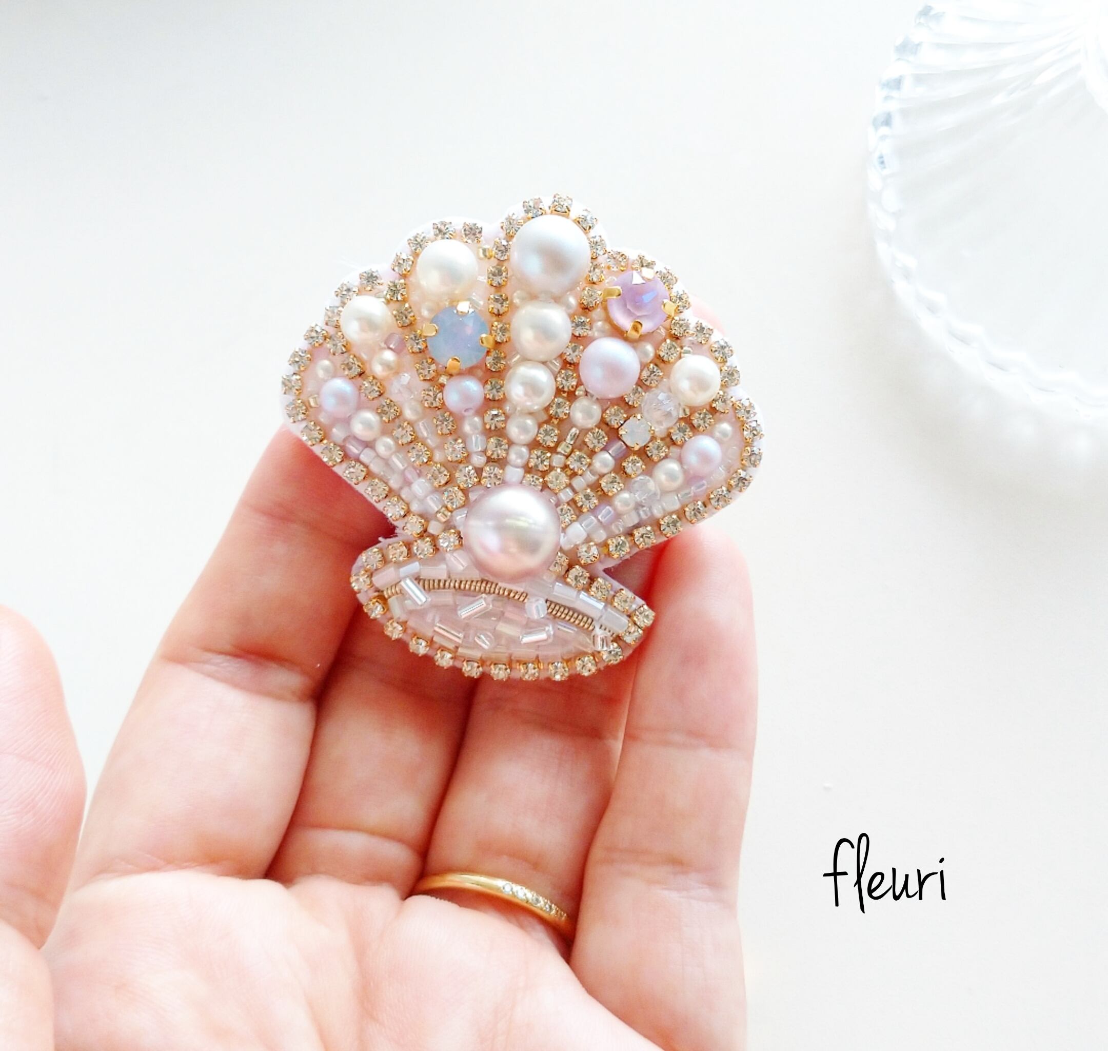 キラキラ輝いた二枚貝のビーズ刺繍のハンドメイドのブローチです。