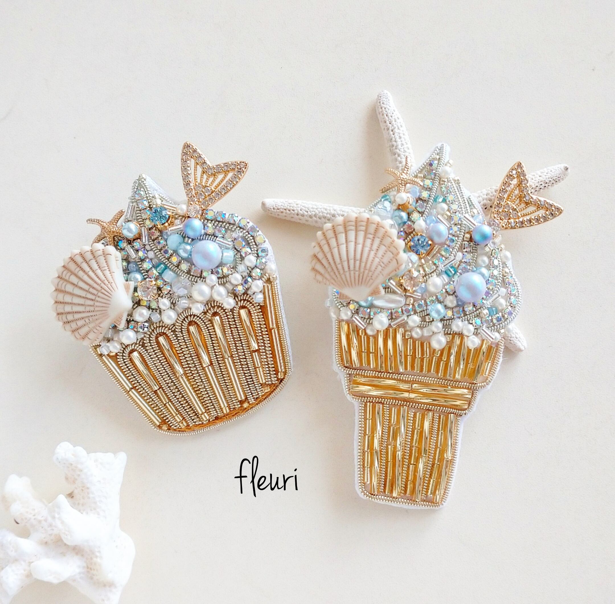 キラキラ輝いた海っぽいソフトクリームのビーズ刺繍のハンドメイドのブローチです。