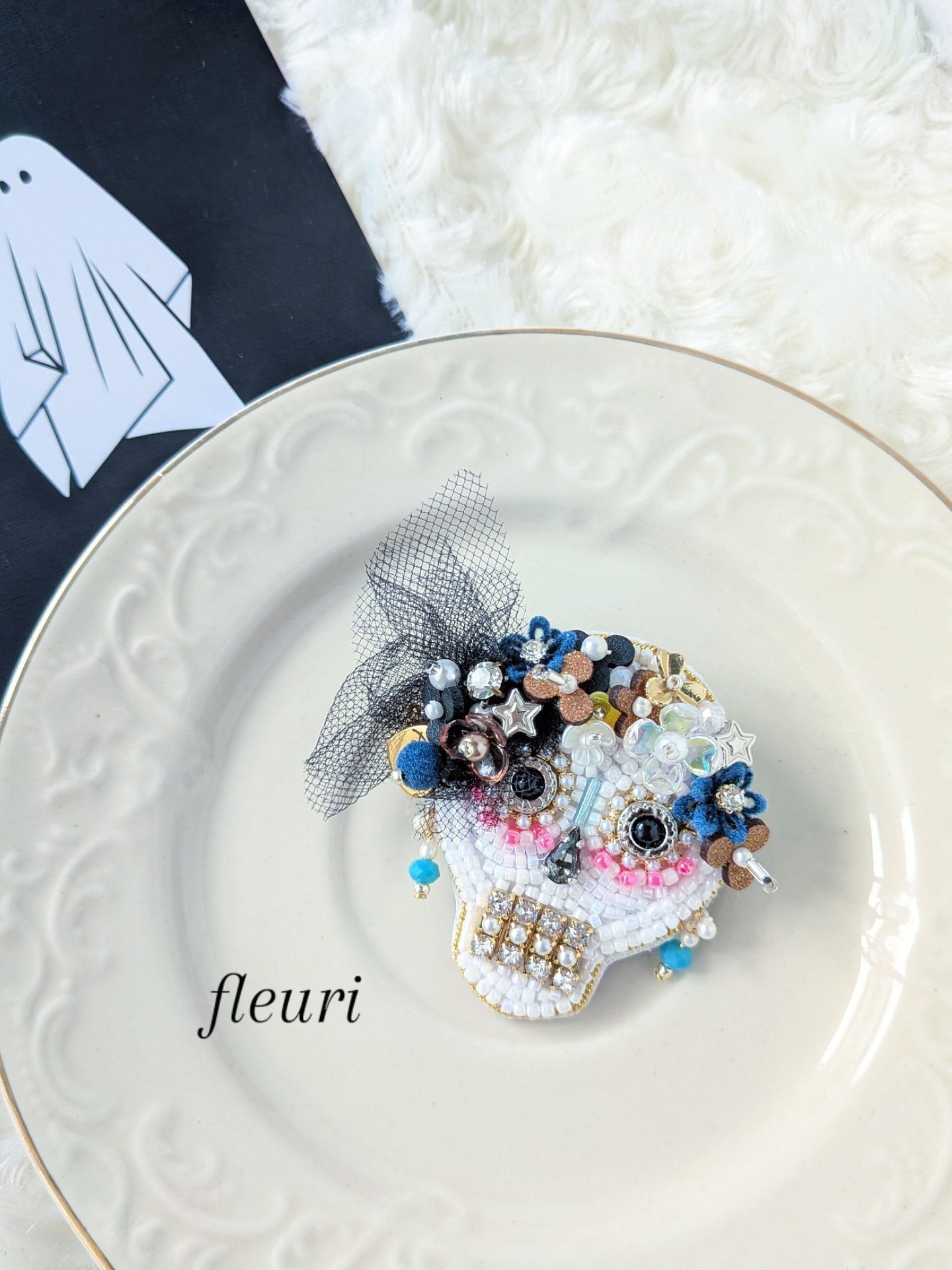 メキシコのカラフルなハロウィンをイメージして作ったドクロの花嫁さんのブローチです。