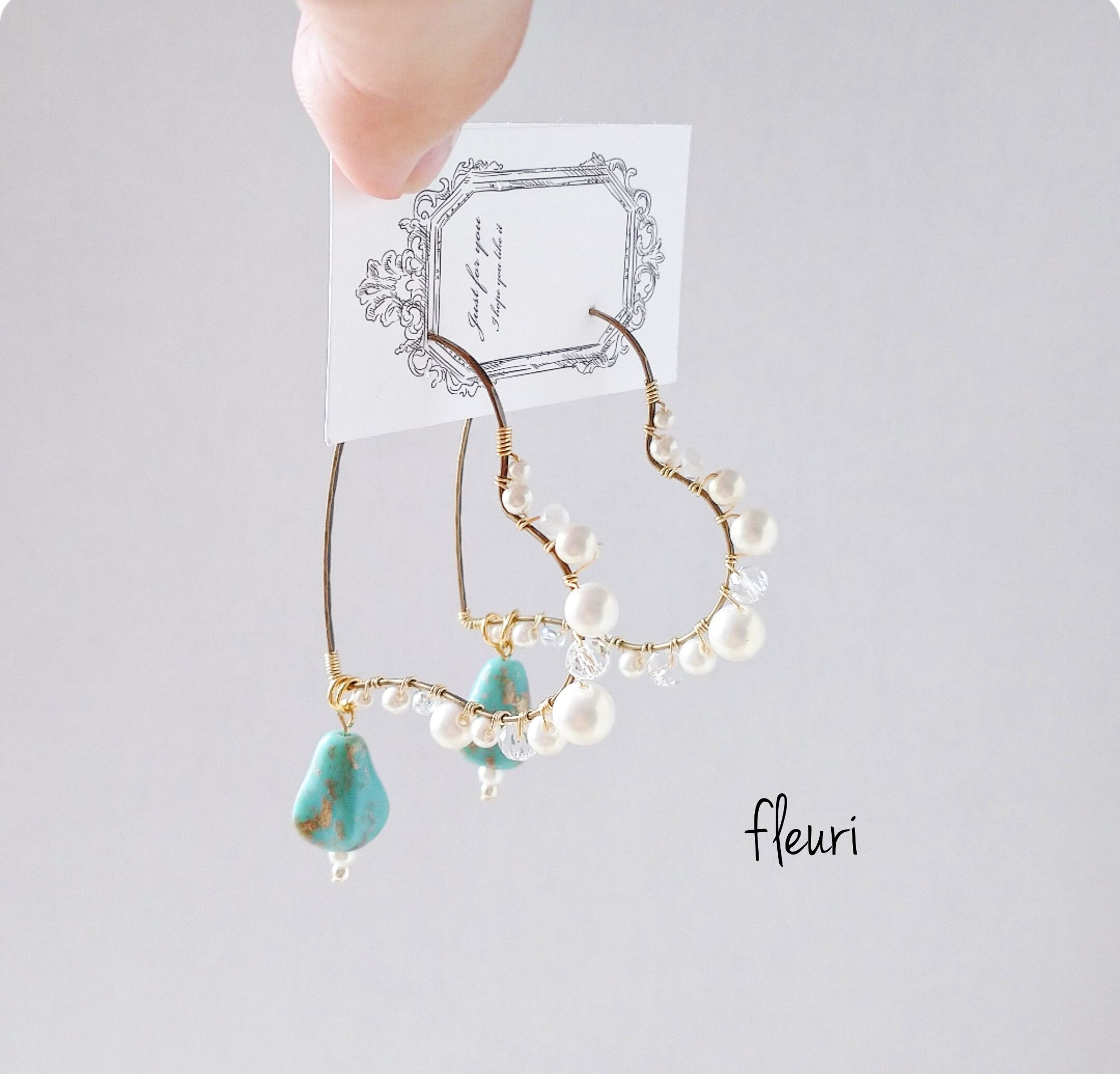 フープにジュエリーワイヤーでパールやビーズを巻き込みました。
