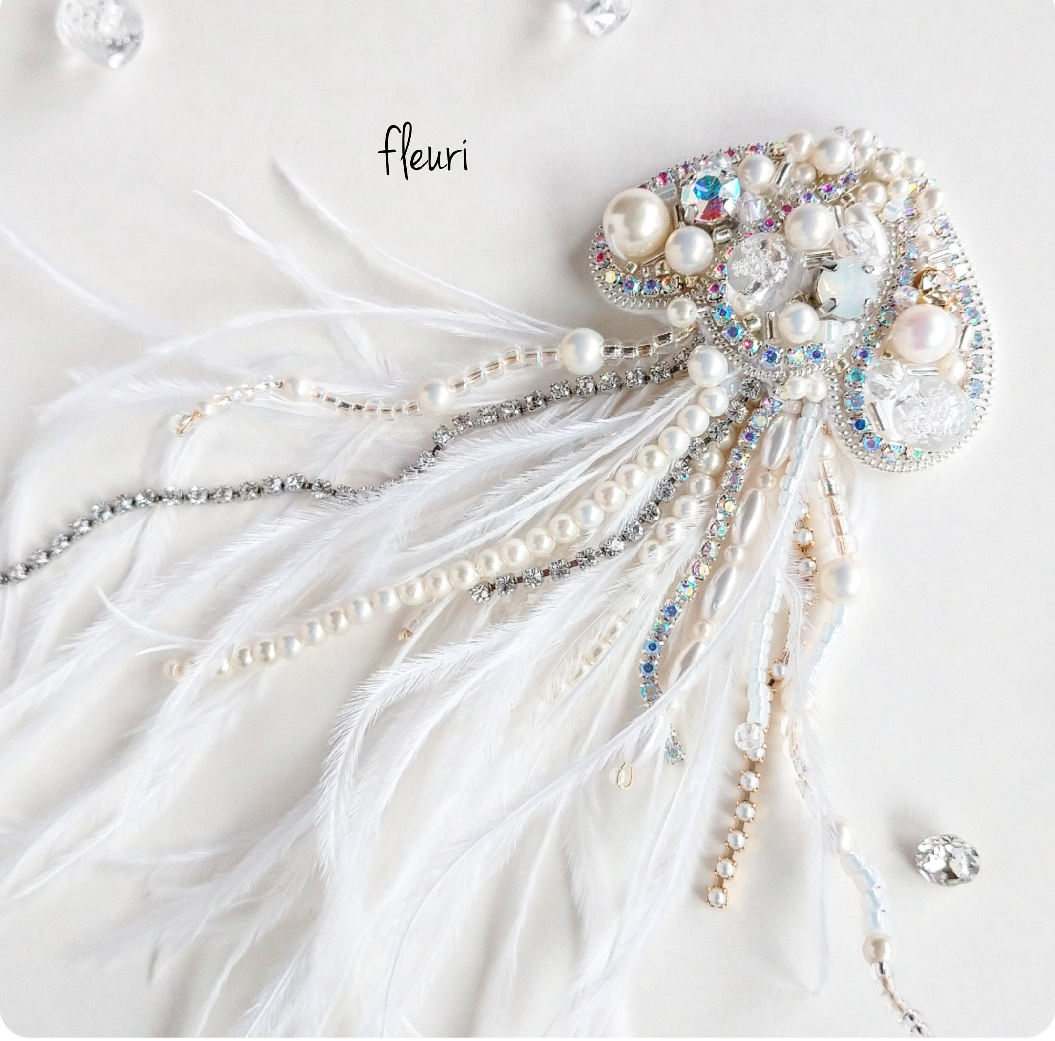 キラキラ輝いたくらげのビーズ刺繍のハンドメイドのブローチです。バッグチャームをつけられる丸カンもついています。