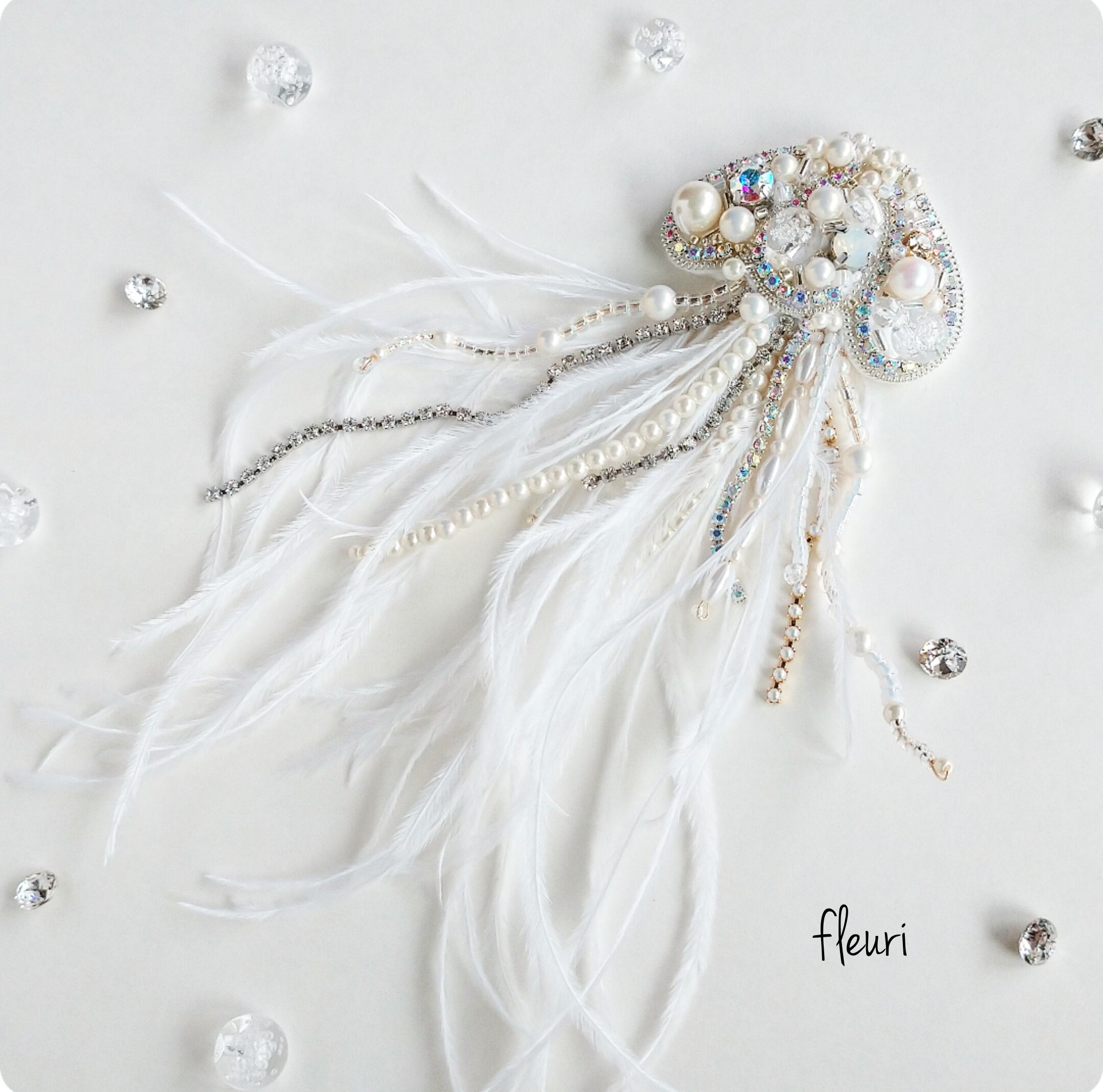 キラキラ輝いたくらげのビーズ刺繍のハンドメイドのブローチです。バッグチャームをつけられる丸カンもついています。