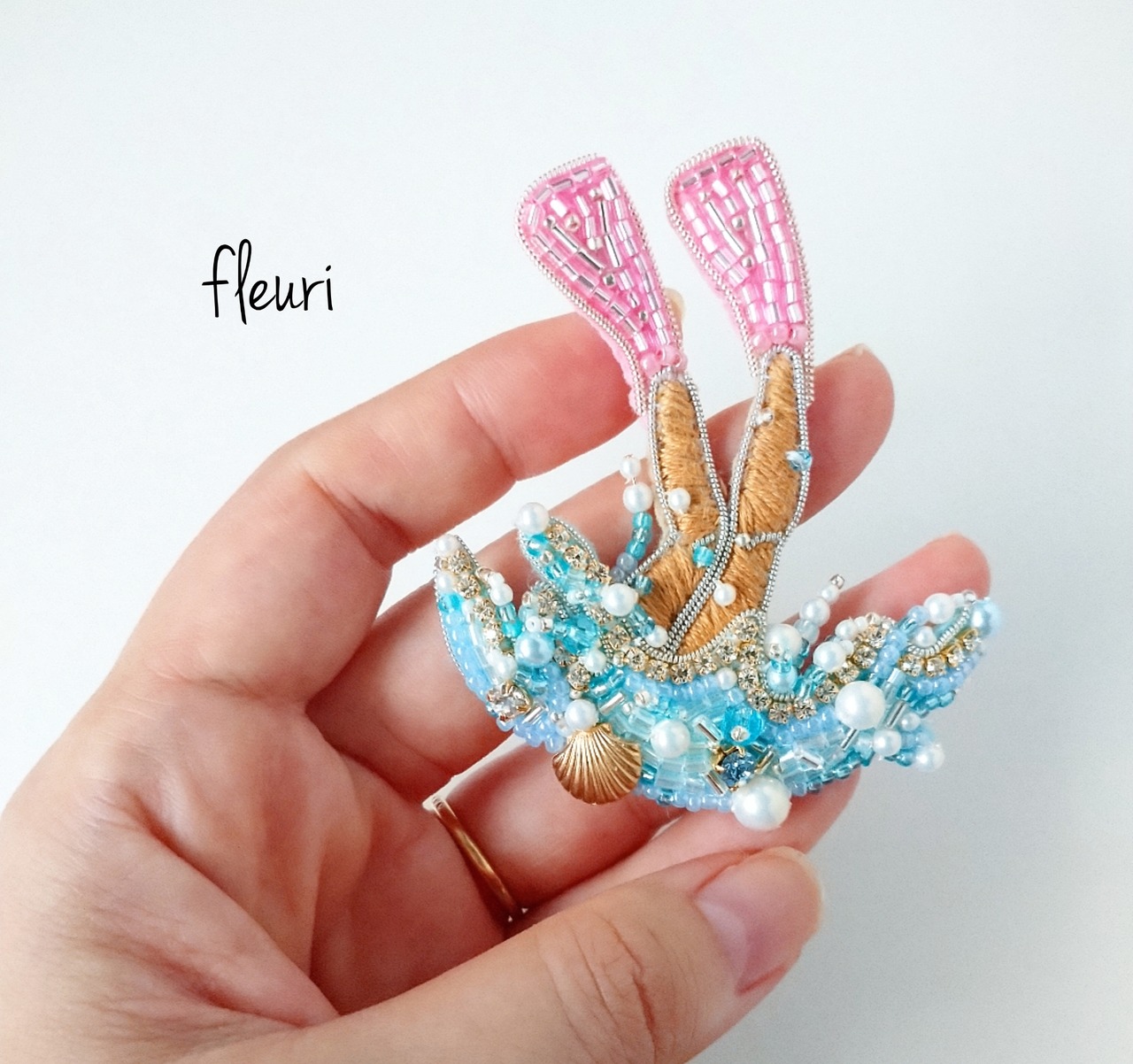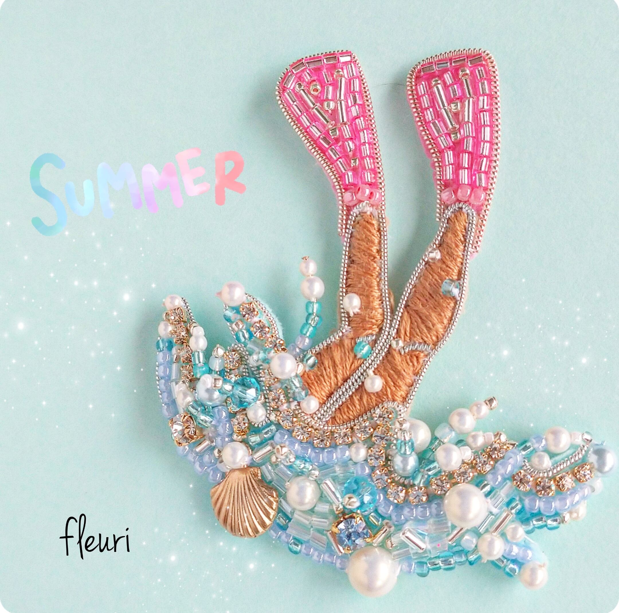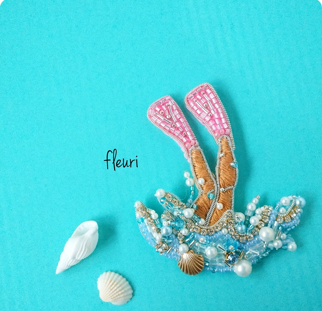 海に潜っている女の子のビーズ刺繍のハンドメイドブローチです。