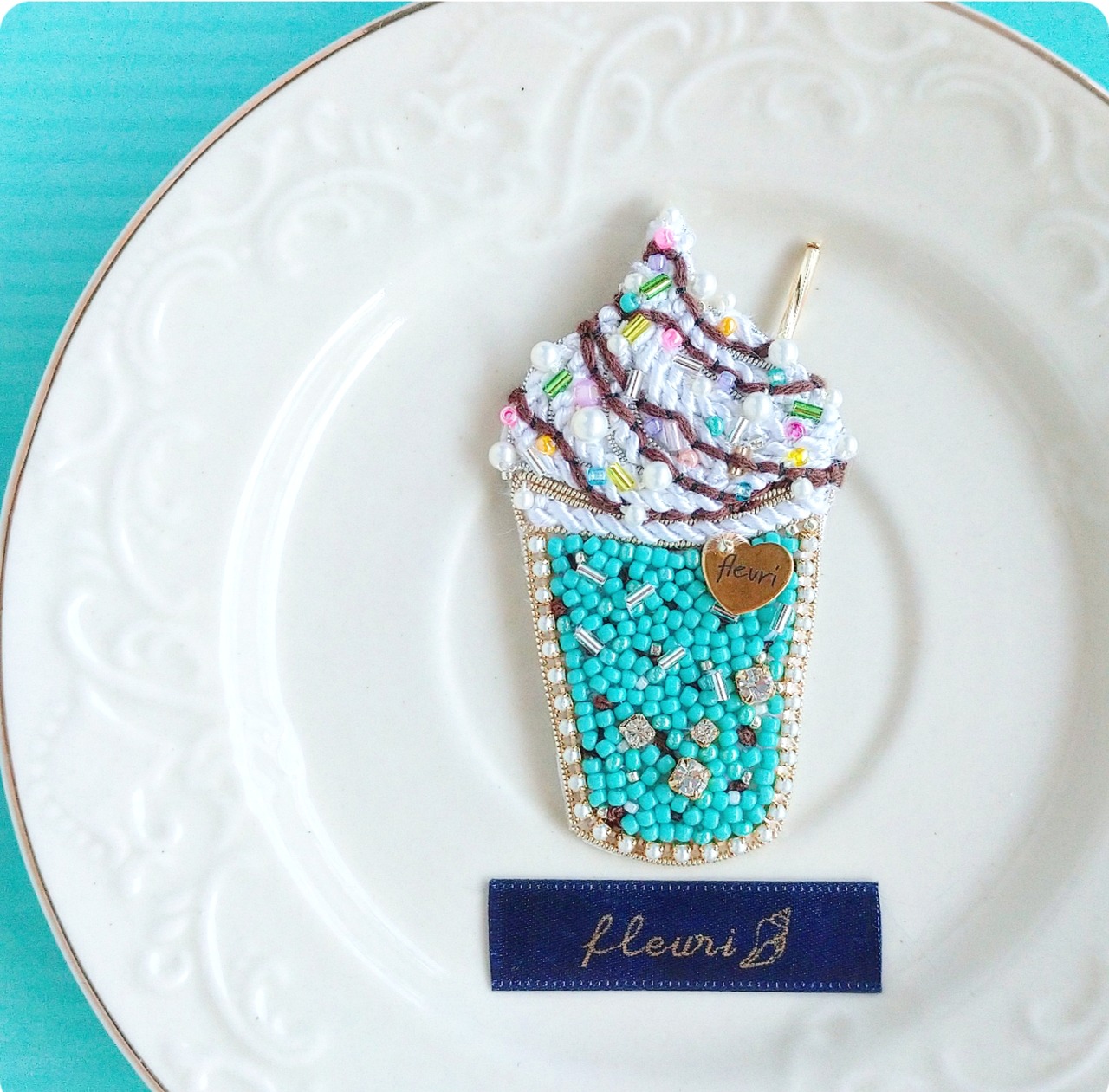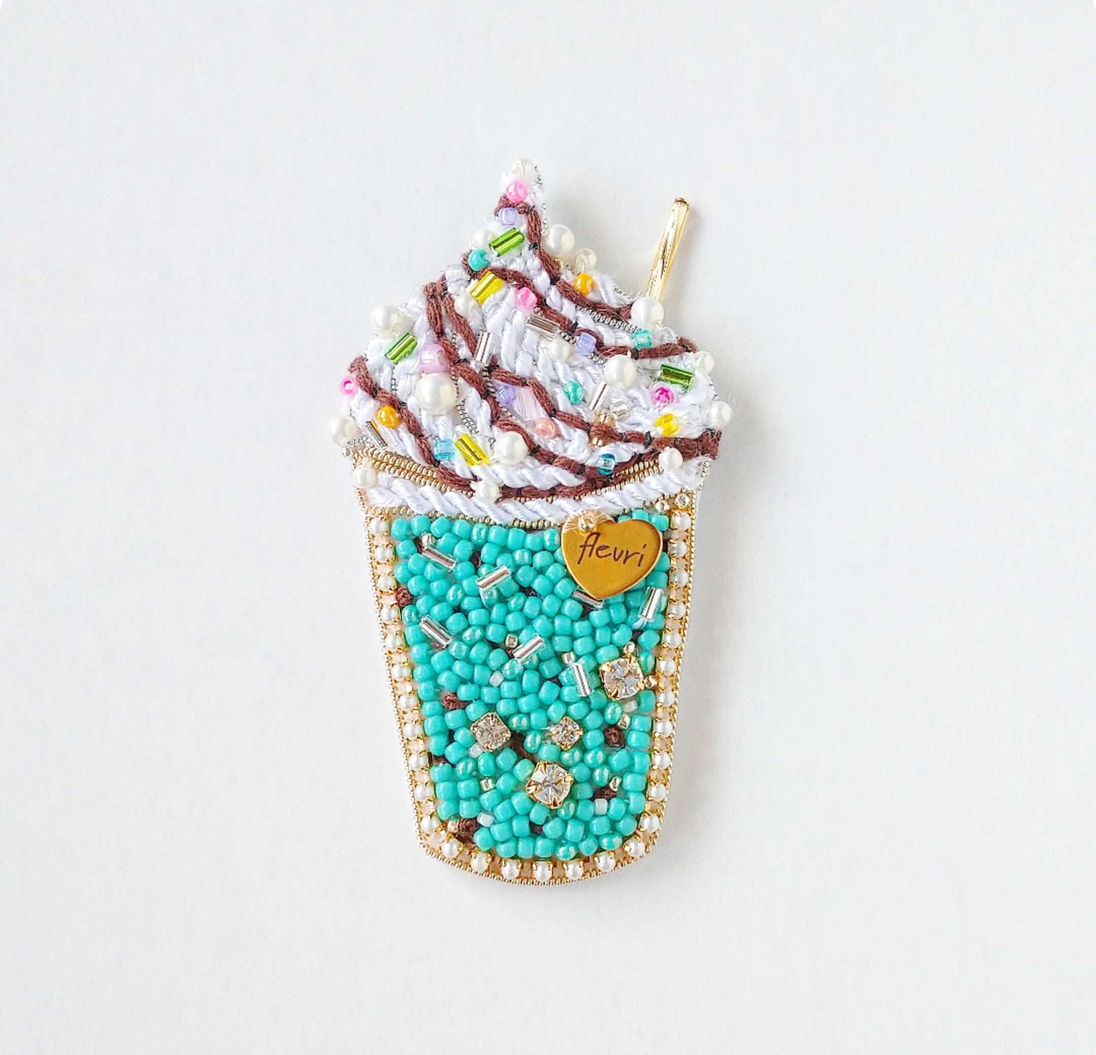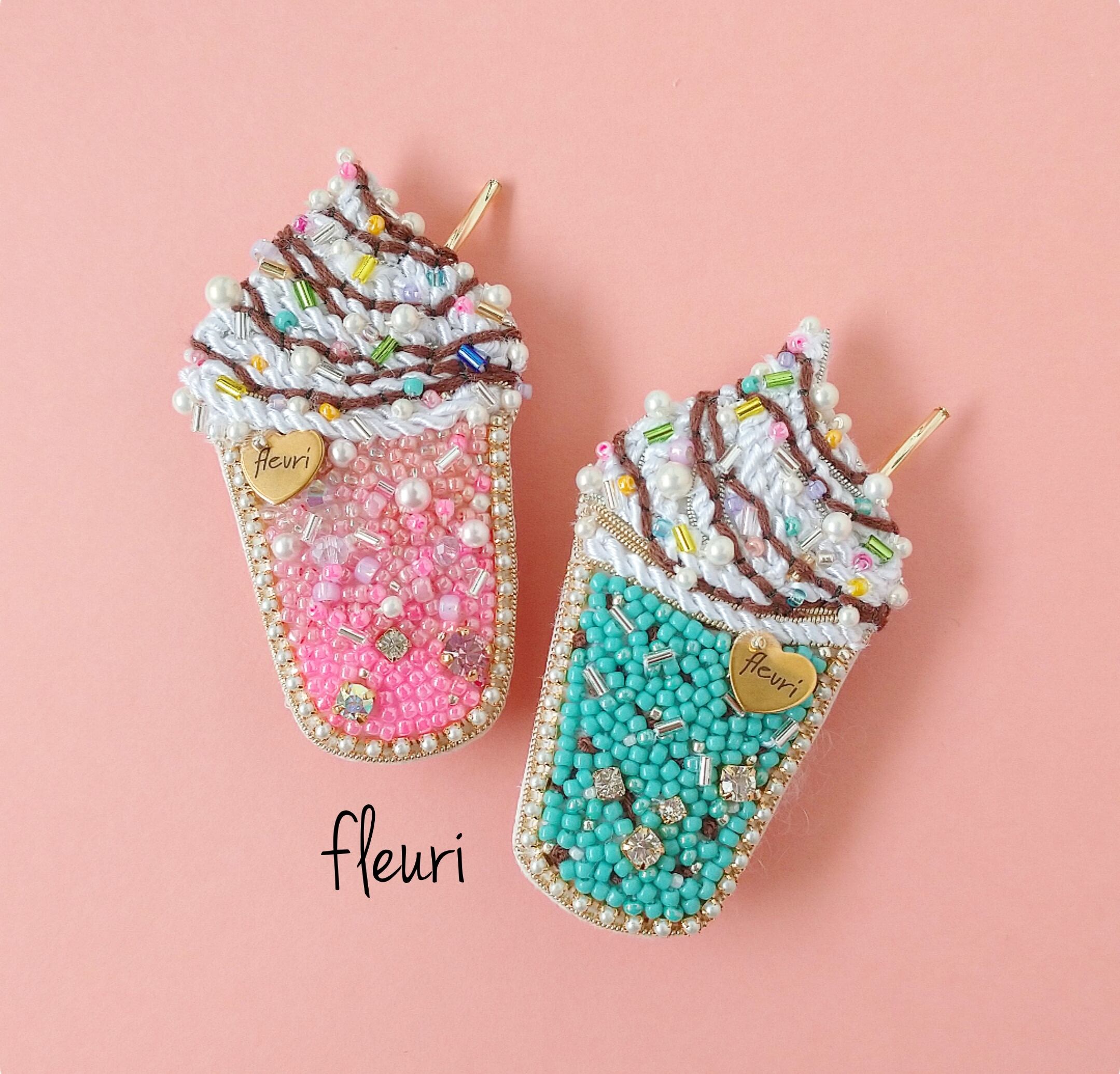 チョコミントフラッペとストロベリーフラッペをイメージしたブローチです。バッグチャームをつけられる丸カンをつけました。