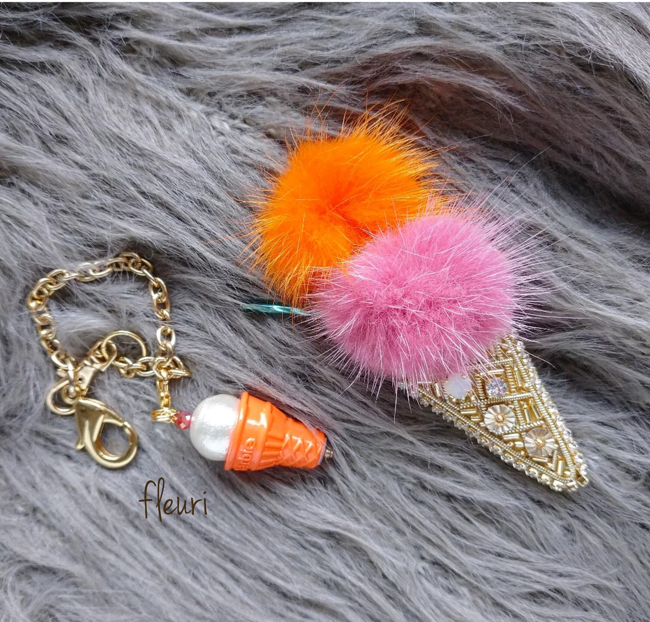 バッグチェーンとミニアイスのチャームもついていて、ブローチにもなります。